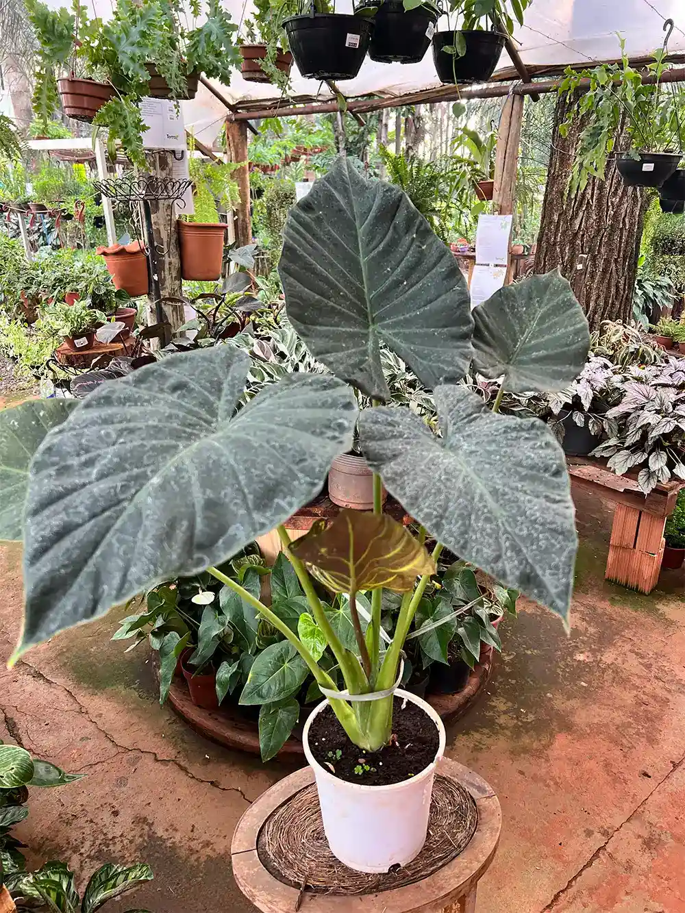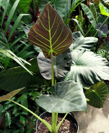 A Alocasia 'Regal Shields' é um hÃbrido popular de alocasia, apreciado por suas folhas grandes e cores escuras e vibrantes. É um hÃbrido de Alocasia ordora e Alocasia reginula. A parte superior das folhas é verde-escura e brilhante, enquanto a parte inferior apresenta tons profundos de roxo com veios verde-claros marcantes.