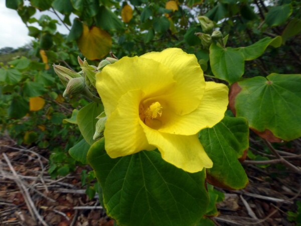 As folhas do Algodoeiro da Praia são grandes e de coloração verde intensa, complementando suas flores vibrantes. Por ser uma planta robusta, ela é capaz de se destacar tanto em jardins quanto em áreas maiores, como parques ou terrenos amplos.