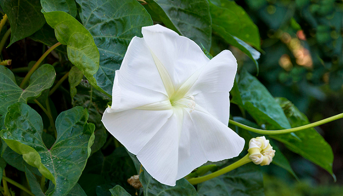Descrição: A boa-noite é uma trepadeira volúvel, de caule semi-herbáceo e seiva leitosa. Ela cresce sobre suportes ou sobre a terra, interlaçando seus ramos. As folhas cordiformes, inteiras ou trilobadas e de cor verde-escura. O florescimento ocorre durante o ano todo, em regiões de clima tropical, ou no verão, sob clima temperado. As flores são tubulares, solitárias, perfumadas, grandes e abrem-se repentinamente ao entardecer, permanecendo abertas durante à noite e fechando-se aos primeiros raios de sol. Uma opção muito interessante para jardins visitados à noite ou à tardinha.