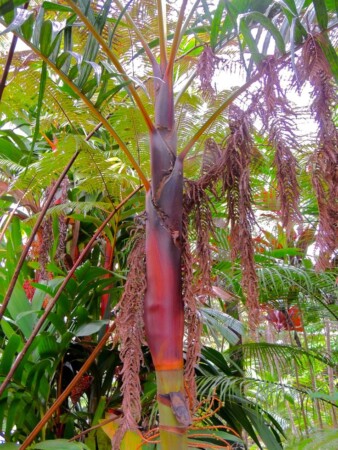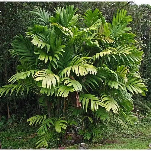 Descrição: Palmeira solitária , elegante, monóica, algo delicada, provida de palmito vistoso e levemente dilatado, de cor marron-amarelado ou marron rosado.