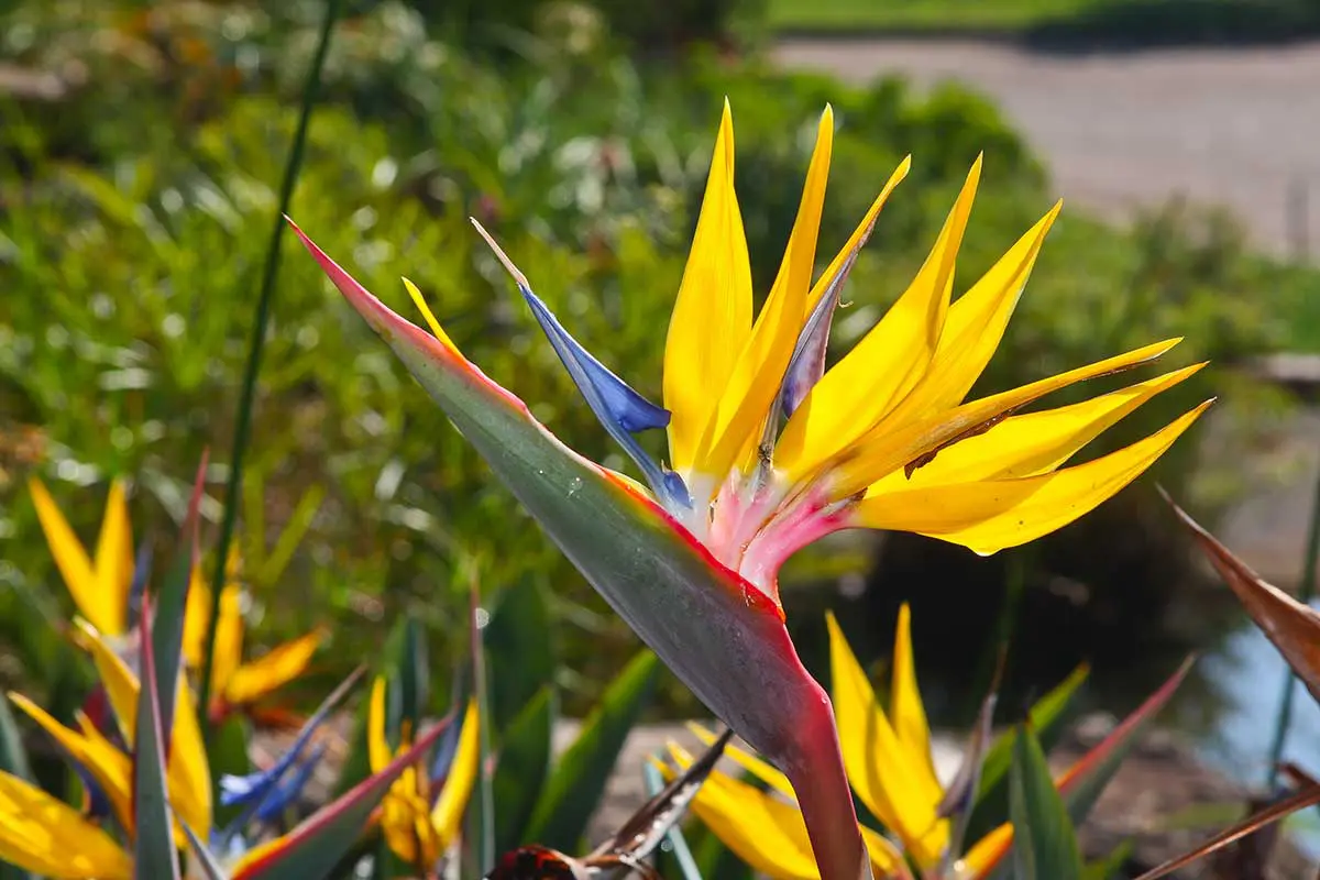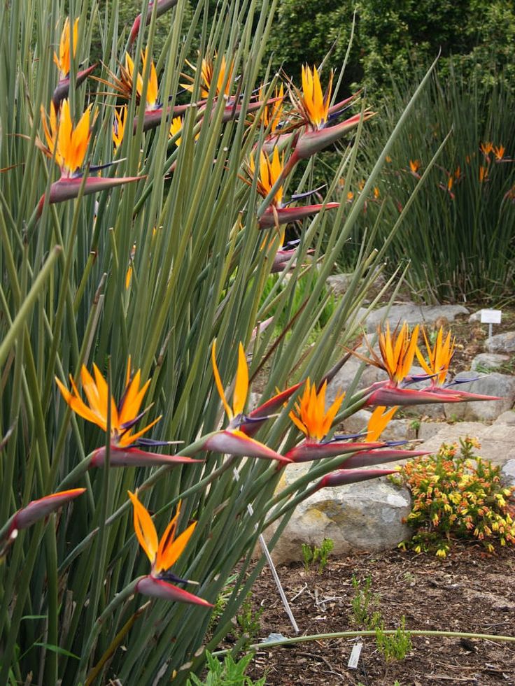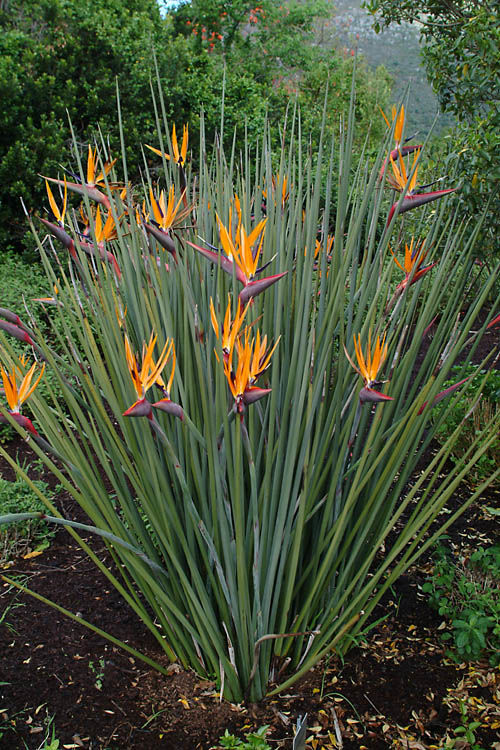 Descrição: A estrelitzia-de-lança é uma herbácea rizomatosa, acaule, ereta e florífera, nativa da África. Tanto a folhagem como a floração são muito ornamentais, apreciadas para cultivo em jardins com características contemporâneas, tropicais e até jardins de pedra. As folhas são em forma de lança, cilíndricas e carnosas, com até 1,8 m de altura. As inflorescências se formam no alto de um pedúnculo, na mesma altura da folhagem, composta por uma bráctea esverdeada, avermelhada ou azulada, de onde ser formam flores de pétalas alaranjadas com estames e estigma roxo -azulados. O cultivo é feito a pleno sol, como uma touceira isolada o em grupos, de forma esparsa ou formando renques. Muito apreciada como flor de corte, pela beleza e coloração tropical das inflorescências, além de serem muito duráveis. É uma espécie muito rústica, que não demanda muito cuidados. O plantio deve ser feito sempre em solo bem drenável, pois não tolera solos encharcados.